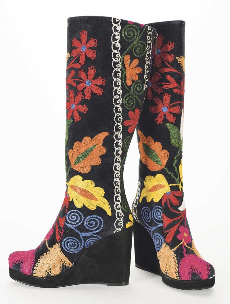 Stiefel »Floras Present«, Italien, Deutschland, 2017, Stickerei in Seide auf textile OberflächeFoto: Grassi Museum / Esther Hoyer